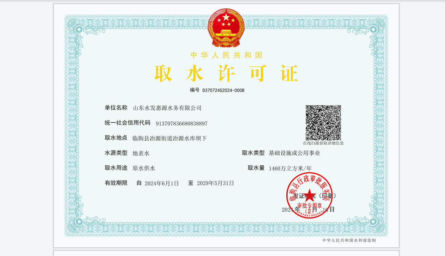 近日,山東水發(fā)惠源水務(wù)有限公司取水許可延續(xù)申請順利通過臨朐縣行政審批服務(wù)局審批,同意取水許可證自2024年5月31日延續(xù)至2029年5月31日,延續(xù)期五年,取水量1460萬立方米/年。