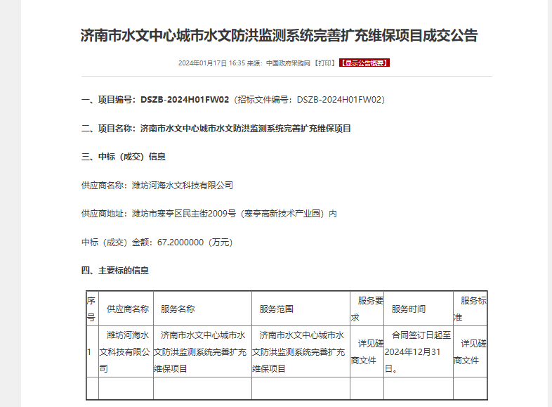 濟南市水文中心城市水文防洪監(jiān)測系統(tǒng)完善擴充維保項目,項目金額67.2萬元,主要服務內(nèi)容為濟南市城市水文防洪監(jiān)測系統(tǒng)完善擴充項目已建站點的日常運行維護、保養(yǎng)、檢修,保障自動測報設備正常運行,使信息化平臺更好服務于防汛監(jiān)測和指揮調(diào)度。