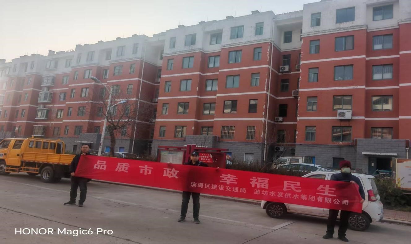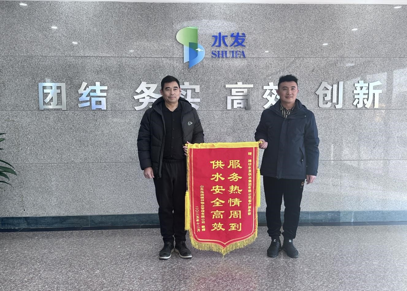 2025年 12月8日,濰坊水發(fā)供水集團(tuán)有限公司客服部迎來了特殊的客人,合作物業(yè)代表將一面印有 “服務(wù)熱情周到 供水安全高效” 的鮮紅錦旗鄭重遞交到客服團(tuán)隊(duì)手中,以最質(zhì)樸的方式,表達(dá)對供水服務(wù)的由衷感激。